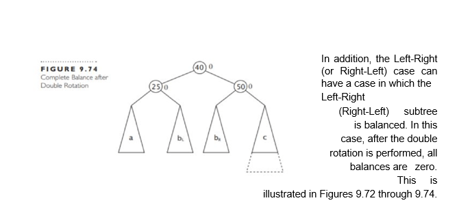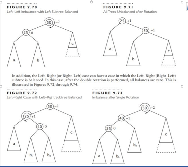 Q3: Complete the AVL Tree class by adding a new constructor that takes a binary tree and checks whether this tree is AVL tree or not. Complete the AVL Tree class by providing the missing methods for removal. Demonstrate that these methods work. Review the changes required for methods decrementBalance, incrementBalance, rebalanceleft, and rebalanceRight discussed at the end of Section 9 .2. Also, modify rebalanceleft (and rebalanceRight) to consider the cases where the left (right) subtree is balanced. This case can result when there is a removal from the right (left) subtree that causes the critical imbalance to occur. This is still a Left-Left (RightRight) case, but after the rotation the overall balances are not zero. This is illustrated in Figures 9.70 and 9.71 where an item is removed from subtree c.