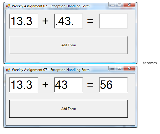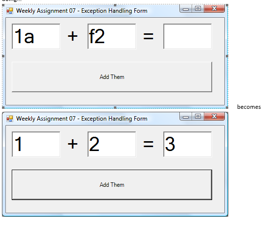 First, write some functionality into the form class that allows basic addition to be performed. The user provides two addends and when the AddThem() button is pressed, the result is placed in the third text box.